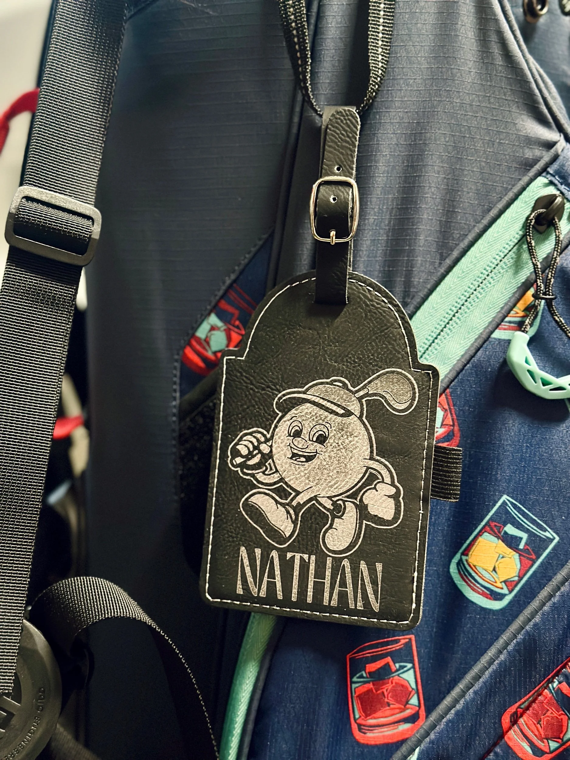 Stand out with this bag tag featuring our fun golf character and your name personalized! Crafted from high quality black leatherette with silver engraving for a finish that catch attention on any tee box! The tag also holds 3 included tees on the opposite side and can be affixed to your bag with the loop style fastener. Please specify your name to be personalized upon checkout!